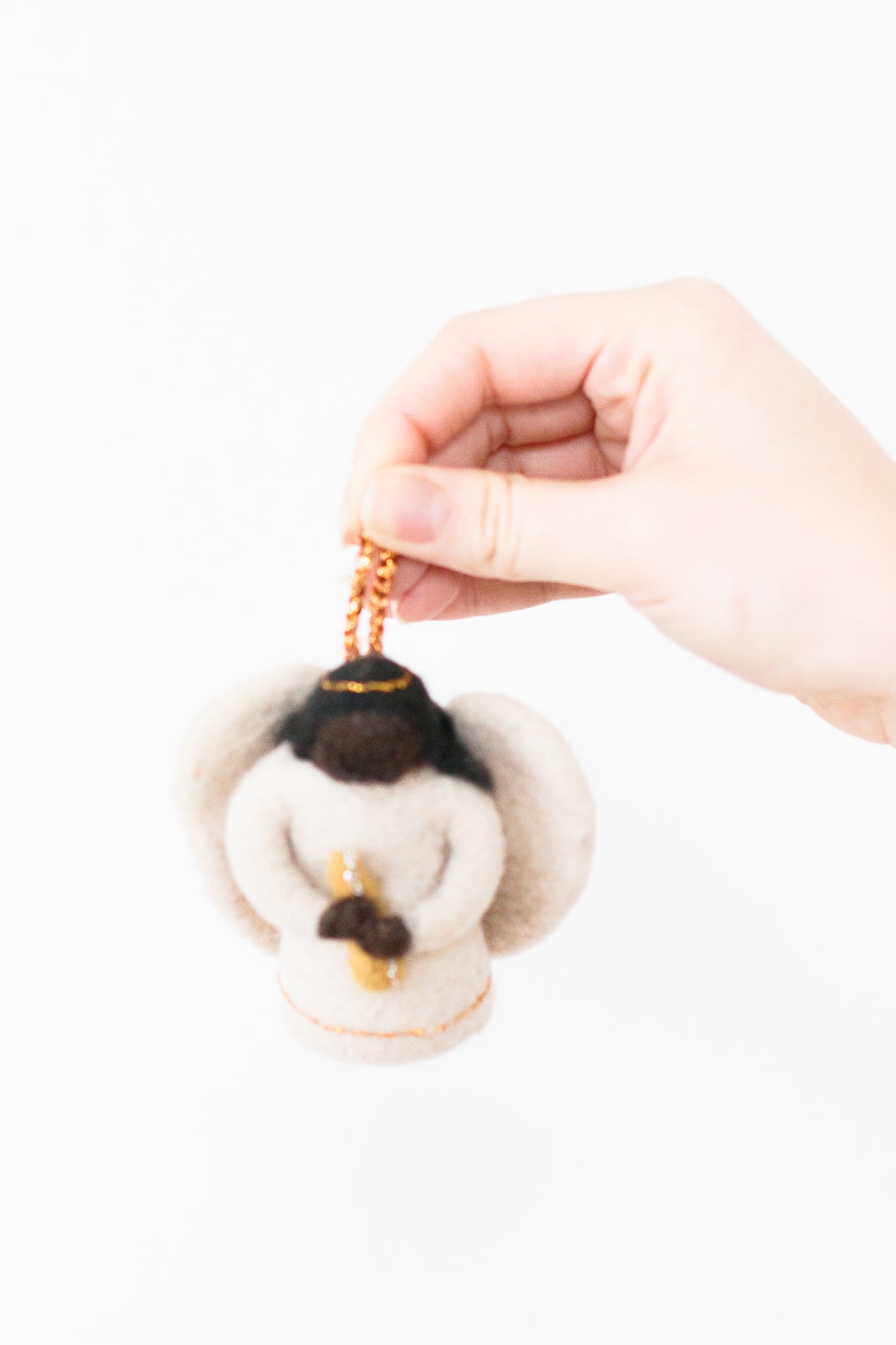 The Herald Angel ornament is the bearer of the good news of Christ's birth. Handcrafted from 100% organic, locally sourced merino wool. The creation of our needle-felted sculptures helps us give dignified and life-saving employment to young deaf women in northern Rwanda.