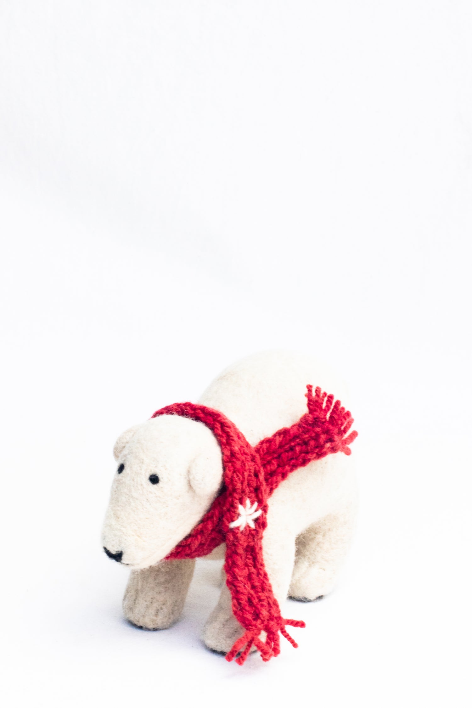 Our Isimbi Polar Bear is new for 2020 and is ready to help you get ready for the holidays. Needle-felted by hand, women working for Handspun Hope in northern Rwanda, create each bear one at a time. Isimbi's red scarf is dyed in a bath of madder root and then knit by hand.